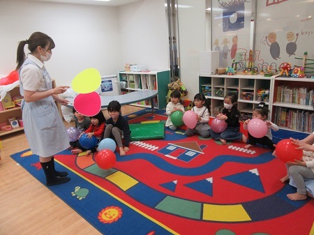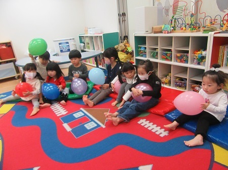 今日はウィンタースクール二日目、フィットネスのレッスンです!テーマは「たくさんのカラフル風船であそぼう!」です。みんなで体操をし体を温めてから風船あそびをしました。うちわや箱を使って風船を運んだり、風船入れ競争や風船袋詰め競争などたくさんのゲームを楽しみながら、いっぱい体を動かしました!
