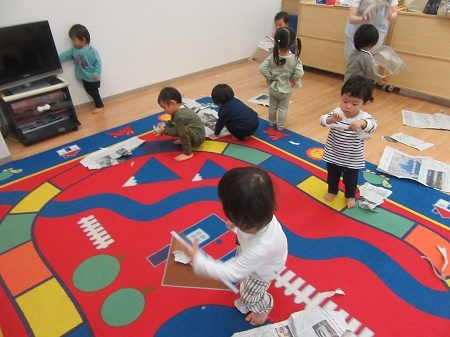 粘土遊びをしました。粘土を握ったり、丸めたり、平らにしたり、転がしたりしていろんな形をつくりました。お友達は粘土の感触を楽しみながら遊んでいました。リズム遊びではマラカスを使いました。マラカスはどんな形の楽器かな?音かな?実際に手に持ってマラカスを鳴らしました♪午後は新聞紙遊びをしました。