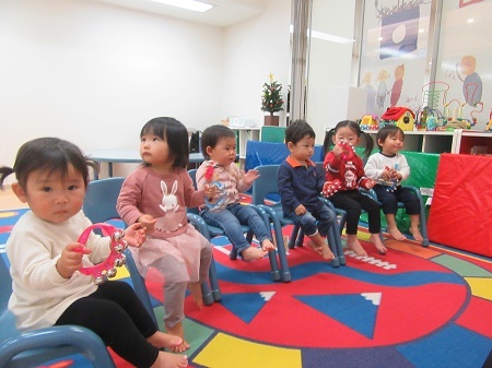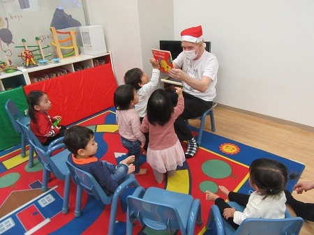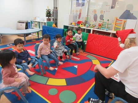 ベイビーズクラスはStorybookのレッスンでした。今月のStorybookは"Spot's First Christmas"です。Spotはお父さんとクリスマスツリーの木を運んで、飾り付けをしました。クリスマスパーティーが終わってベッドに入りました。朝起きるとプレゼントがありました。お友達は絵本を見て、嬉しそうでした☆幼稚園クラスでは、たくさんのChristmas Songをうたいました。Christmasで使うものやキャラクターなどの名前を、英単語で言いました。みんなが大好きなChrismas!とても楽しそうに英単語を発音していました☆