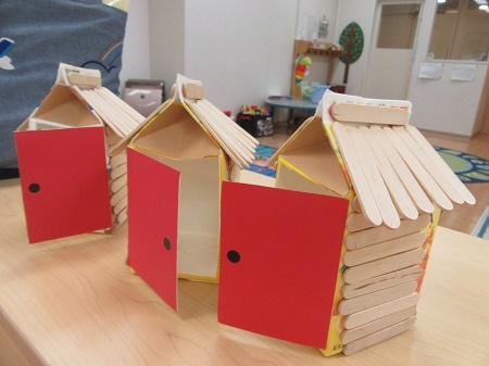 ベイビーズクラスのレッスンはArts & Craftのレッスンでした。Christmas Photo Cardを作りました!マイケル先生と一緒に写真を撮り、カードに貼りました。お友達はいろんな色のかわいいスタンプを押しました。自分だけの素敵なオリジナルカードが完成しました☆幼稚園クラスのは今月のStoryBook"Three Little Pigs"のStory Craftのレッスンでした。物語でこぶたが作る家を、みんなで作りまし牛乳パックに木製のスティックを貼ります。牛乳パック一面に貼るので、たくさんの量のスティックです!頑張って作り、素敵なStick Houseが完成しました!