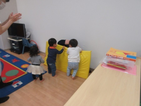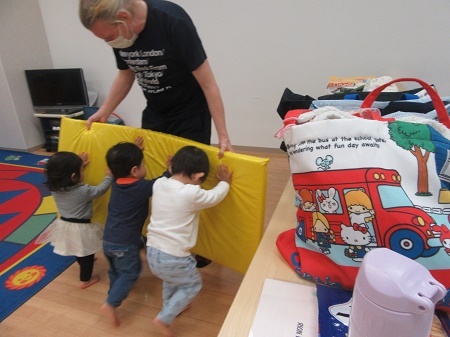 ベイビーズクラスはFitnessのレッスンでした。マットを使って体を動かしました。マットの上で数を数えながらjumpをしたり、マットをpushuしたり、マットの上をrollingしたり楽しく英語を使いながら体を動かしました!