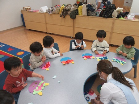 節分製作ではおにのお面を作りました。パーツはすべて、教材の中から好きな色を選びました。紙を切ったり、貼ったりの活動をして、かわいいおにさんの出来上がりです!!(お面の写真のみツイッターにアップしました。)GO!STOP!では動く、止まるの合図を聞き、身体を動かしました!