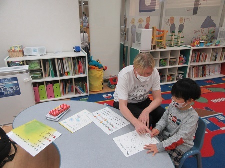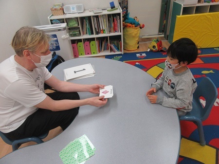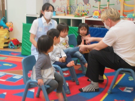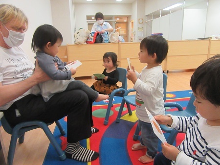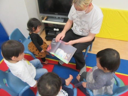 ベイビーズクラスはStorybookのレッスンです。今月のStorybookは"Who Stole the Cookies?"です。クッキーがなくなりました。だれがとったのかな?足あとが残っている!だれの足あとかな?rooster,cat,elephant,duck,みんなの足あとはどんな形?さあだれがクッキーをとったのかな?幼稚園クラスでは今月のStorybook"The Little Red Hen"を読み始めました。Red Henのお家には、goose,cat,dogが一緒に住んでいます。今月はこの絵本を読み進めます!形カードでいろんな形の英単語を覚えました。