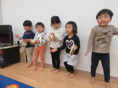 「大きなカブ」の絵本を読みました。読み終わった後に、お話に出てきた登場人物を聞きました。お友達は良くお話を聞いて見ていたので、登場人物全員を言うことが出来ました!楽器を使ってあそびました。ロープをたどっていくとフープがあります、フープの中には楽器があり、楽器を鳴らします。たくさんの楽器を探してゴールしました。みんな楽しそうに楽器を鳴らしました☆