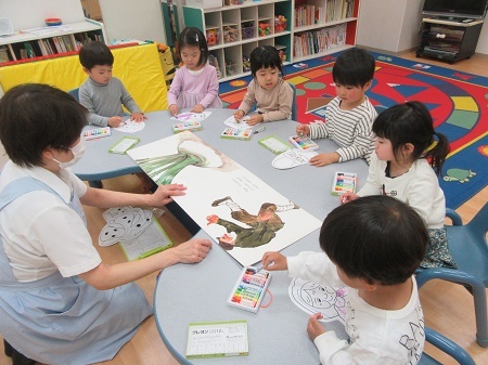 「大きなかぶ」の役を決めました。「どの役をやりたいか、お家でお母さんやお父さんとお話してきてね。」と前回のレッスンでお伝えしていました。みんなすぐにやりたい役を決めることが出来ました。今日は自分の役のお面を作りました。丁寧に一生懸命にクレヨンでお面を塗りました。自分で作ったお面をかぶって、劇の練習をしました!