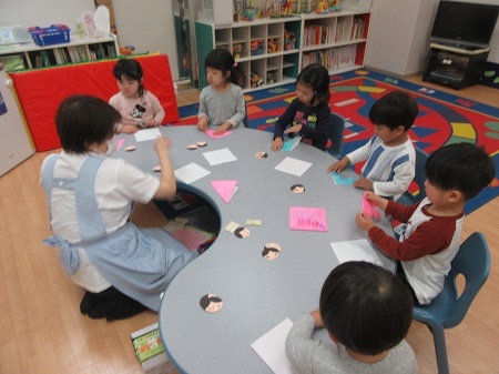 ひな祭りの製作を行いました!お内裏様とお雛様の着物に模様を描いたり、クレヨンで目・口を描きました。ももの花の台紙のお内裏様とお雛様を貼り付け完成!!とてもかわいい作品に出来上がりました☆サイコロあそびをしました。サイコロの目を数えました。みんなでサイコロを転がして、何の目が出たか確認しました。