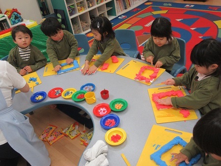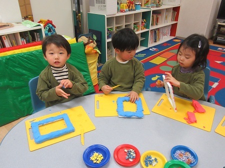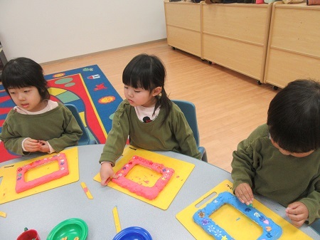今日は修了式にお渡しする写真立てを作りました。写真立てのフレームに紙粘土をのせて、かわいいかざりボタンで飾りました!この後写真立てを乾かして、修了式当日にお友達の手元に届きます。楽しみにしていてくださいね☆