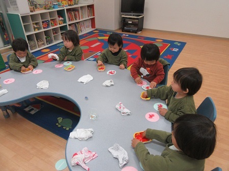 おひなさま製作をしました。今回は道具を使わず、自分の指に絵の具をつけて模様を描きました。人形の顔もつけて、可愛いおひなさまになりました。午後は新聞遊びをしました。丸めてボールを作り、玉入れをしました。最後は新聞ボールにカラーボールも混ぜ、たくさんのボールで遊びました!