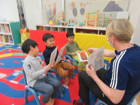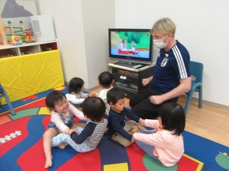 今日のレッスンはお歌に合わせて体をしっかり動かしました。"Under the Spreading Chestnut Tree"では、両手いっぱい広げて大きな木を作るマネをしました。"Row,Row,Row your boat"では、お友達と仲良く手をつないで船をこぎました!