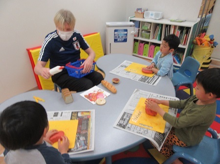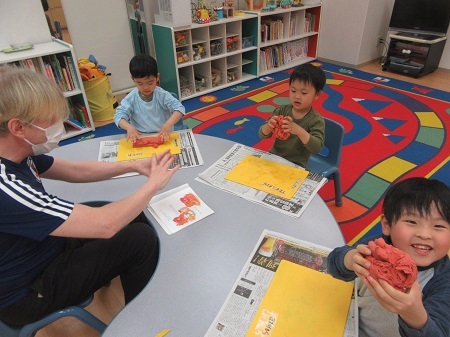 今月のStorybook "The Little Red Hen"は、畑に植えた小麦でパンを作るお話です。粘土を使ってそれぞれに好きなパンを作りました。French Bread,Waffle,Doughnutとみんな違うパンを作りました。美味しそうでした!