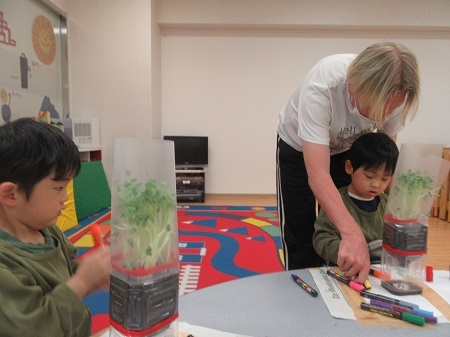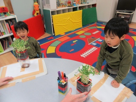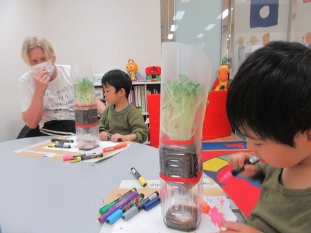 かいわれ大根とご対面です !! 立派に成長していて、皆さん目を丸くして驚いていました。かいわれ大根の入ったペットボトルの容器にペンで素敵な色付けをしました。オリジナルの鉢に大変身☆育つ楽しさを学びました。