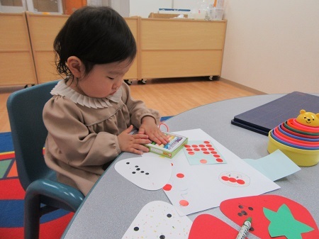 いちごやおにぎりの制作をしました。シール貼りがお気に入りのお友だち、すすんで行うことが出来ました。いろいろな「楽しい」を見つけながら頑張りました!