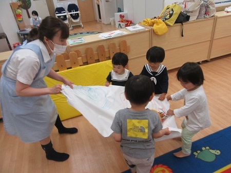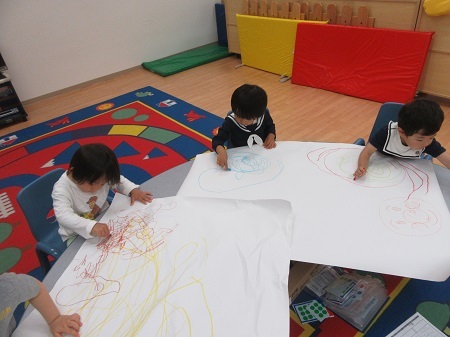 大きな紙にみんなでお絵描きをしました。自分で好きな色を選び思い思いに描きました!いつもより大きな紙に嬉しそうにグルグルと描いていました。体を動かす活動では大きな紙に物を乗せて落とさないようにみんなで一緒に運んだり、曲に合わせてマットの周りを歩いて止まる遊びも楽しみました☆