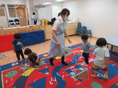 やわらかい花紙を丸めたり、のりづけをして楽しみました。大好きなマット遊びでは全身を大胆に動かし、お友だち同士顔を見合わせながら元気いっぱいに活動できました!