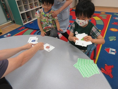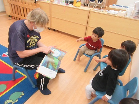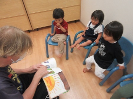 "THE VERY HUNGRY CATERPILLAR" 読み聞かせでした。大きくなったあおむしがちょうちょに成長した姿を見て驚いていました。英語の歌も元気いっぱいに楽しむことができました。