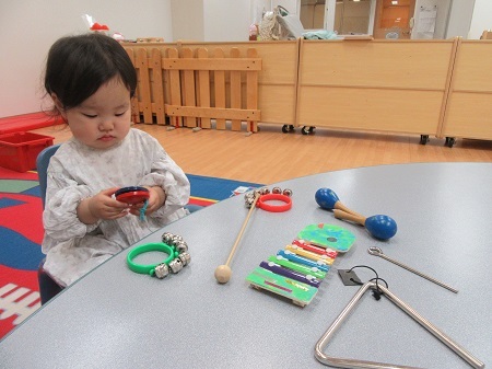 楽器遊びでは、「どんな音が出るかな?」と楽しみながら1つずつ触れ、お気に入りを見つけました。制作で作った楽器、お気に入りの楽器を持って講師と一緒に演奏会をしました ♪ マット遊びではバランスを取ったり、身体をたくさん使って少し難し事にも挑戦しました。