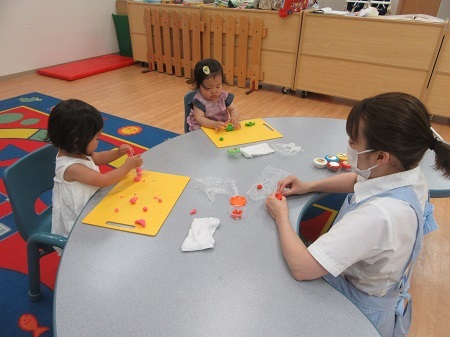 食べ物を学ぶレッスンでは、粘土で美味しい物、お友だちが好きな物を作りました。制作ではこの季節にぴったりのお花「あじさい」を作り、むらさき色のきれいなお花を咲かせました。平均台やボール遊びで元気に遊びました。