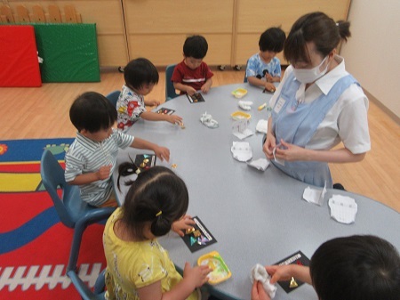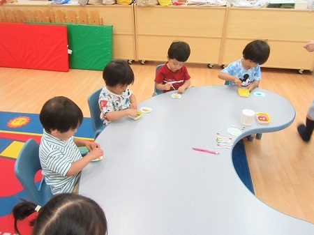 暑中お見舞いのはがき作りでは花火・ヨーヨーの絵柄を作りました。2種類ともに素敵な作品ができました。清潔についての活動では「手洗い・うがい」をはじめ、爪切りについてなど身の回りのことを学びました。