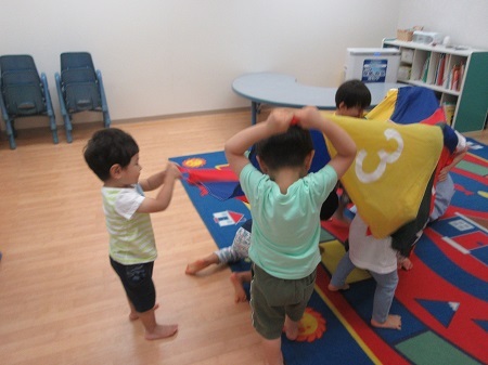 うちわ作りをしました!皆さんの手型・足型を使って素敵な作品に変身しました。これからの時期にぜひ使ってくださいね♪ 動的な活動ではパラバルーンを行いました。身体を使って上下を学んだり、中に入ってみたりと楽しいレッスンでした。