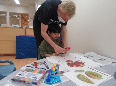 今月学んできた "Fruits" について、とてもよく覚えていて、イラストを見るとスムーズに答えることができました。前回のレッスンで染めたハンカチに "Fruits" の絵を描き、オリジナルの素敵な作品が完成しました。