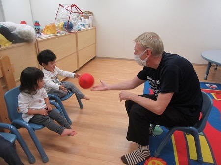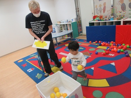 色々な色(Color)についてのレッスンでは、ボール を色別に集めて、玉入れゲームをしました。色の名前をよく覚えていて、とても楽しんで行うことができました。"Throw" と "Catch" の声掛けに合わせてキャッチボールも楽しみました。
