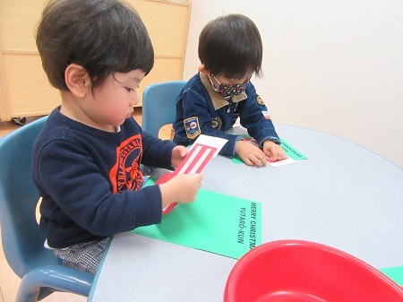 クリスマスレッスン!クリスマスソングは鈴を鳴らしての演奏会♪ クラフトではクリスマスカードを作りました。サンタさんに変身した、講師にみんな大喜び!!楽しいレッスンでした。