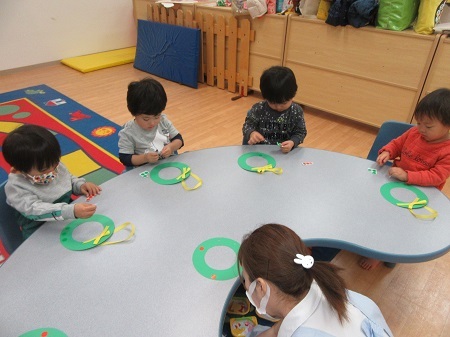 クリスマスレッスンでした☆‼ お歌、ゲーム、制作全てクリスマス一色の楽しいレッスンでした♪ サンタさんがみんなのおうちに迷わず来てくれるようにリースの飾りを作りました^^
