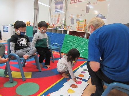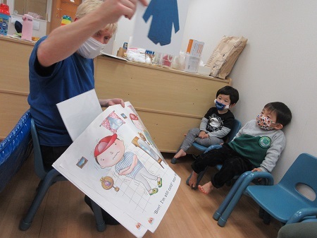 "Cold" と"Hot" についてのレッスンでした。テーマにちなんだ歌や絵本を見て学びました。寒い日の洋服や出掛ける時の服装も楽しく歌を聞きながら、講師の真似をして発音の練習をしました。