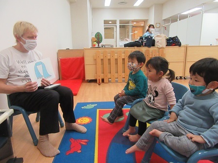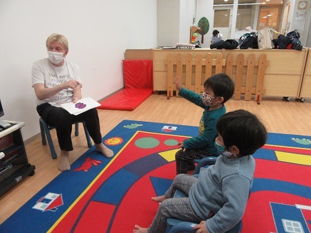レッスン開始のご挨拶、天気いついての活動が元気に行えました!絵本の時間では "HUG" という絵本を見ました。内容を理解しているからこその子ども達の表情が見られ、楽しまれていました。