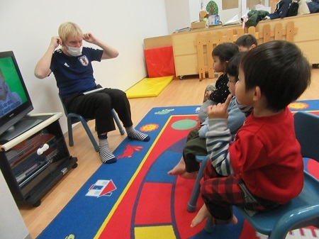 身体を "ごしごし" ♪ "Soap" のカードを手に楽しい音楽に合わせて、身体を洗いました。部位についても学び、頭・肩・手・膝・足先を英語で元気に言うことができました。