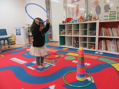 たくさんのカラフルなコップを重ねて、コップタワーを作りました。"高い" "低い"を学びながら、今度は輪投げに挑戦です!大きいフープを力いっぱい投げて、輪投げ遊びを楽しみました。