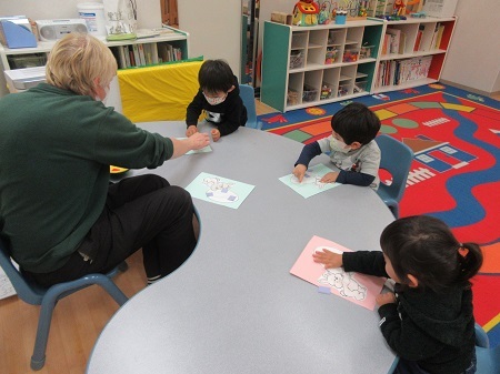 「イースターエッグ」と言う絵本を見たり、聞いたりし、クラフトでは実際にイースターエッグを作りました。いろんな色の紙を飾り、素敵なイースターエッグができました。