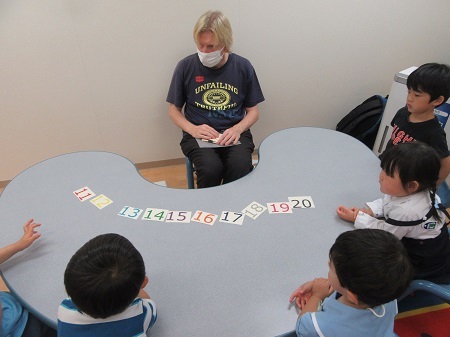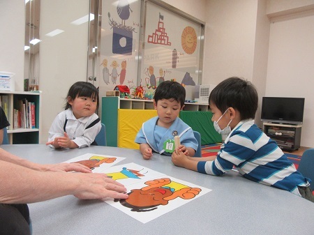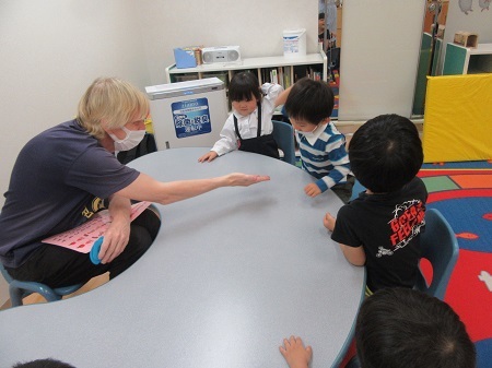 少し緊張しながら,お隣のお友だちに'How are you?'と聞くことが出来ました。みんな、先生とタッチするのが大好きで、質問に答えられた時は喜んで元気よくタッチします。