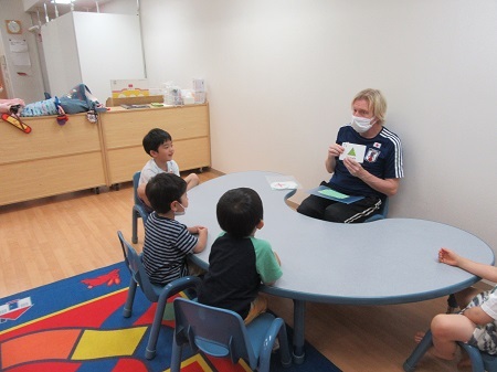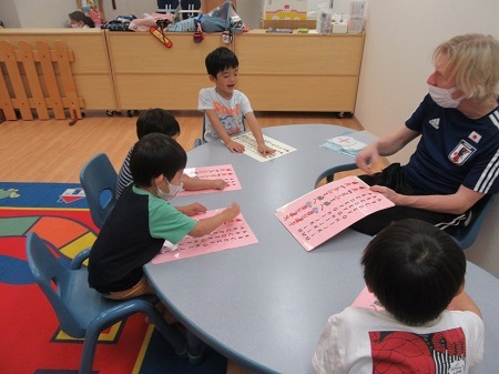 達成感が味わえた回でした。挨拶や1~20までの数字、自分の歳など、言える言葉が増えてみんな嬉しそうでした。手の指を使って "Family"の言い方や、"UP !DOWN !"などの反対言葉も学びました。