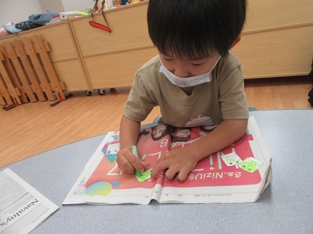 数字、月、色の言い方を復習した後、「G」の書き方を練習しました。そして、クラフト制作へ。今日は、カエルの空気砲を作ります。色塗りをしたカエルと、どうぶつシールを貼り、できあがったら、的に向かって発射します。みんな大興奮!とっても盛り上がりました。