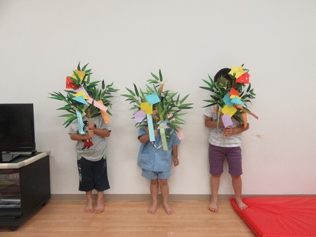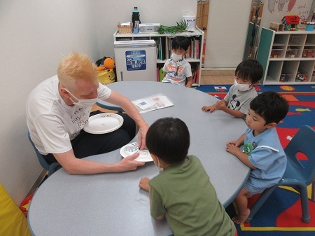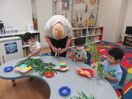 7月のビッグイベント、七夕飾りを作りました。形や色などに触れ、作りながら英語を学んでいきます。毎回のレッスンで学んでいる、"sunny,cloudy,rain"ですが、 日本語と英語を一致させ理解し、スムーズに発音していました。
