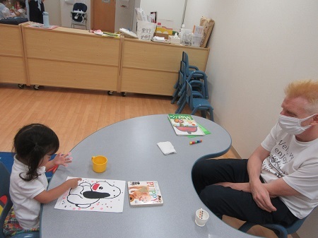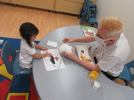 クラフト制作をしました。DOG の目、鼻、口を貼ったり、シールをたくさん貼って楽しみました。また、ふんわりしたものやザラザラするものなど、手で触った感触を英語で表現してみました。