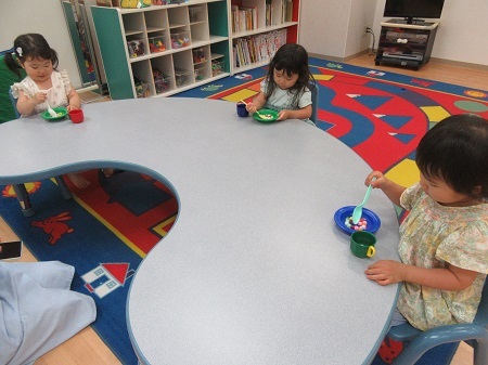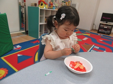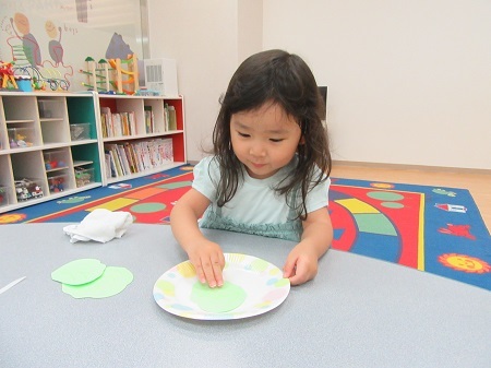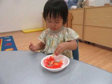 みんな大好き、食べ物のについてのレッスンでした!そして制作では、スパゲッティーとサラダを作りました♪ 指先の細かい作業にも集中して取り組み、上手に出来た時の達成感を楽しんでいました。