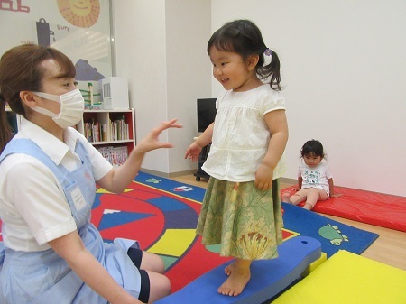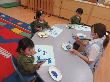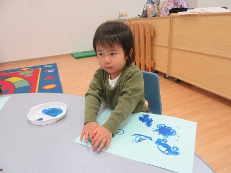 乗り物についての活動でスタンプ制作をしました。両手で力を込め、上手に押すことが出来ました!マットや平均台でバランス力を培う活動にも挑戦しました。