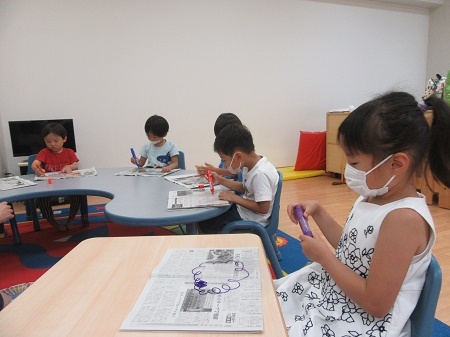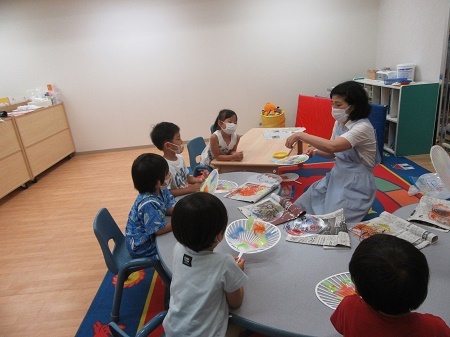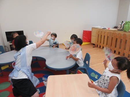 夏にぴったりのクラフト体験、今回はうちわをつくりました!透明のうちわはにお絵かきをしたりうちわの中には素敵な羽をちりばめました。カラフルでとてもかわいい作品ができました♪ 午後には色を使ったゲームに挑戦!楽しい時間を過ごしました。