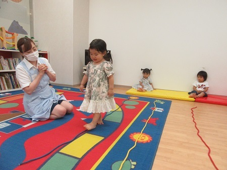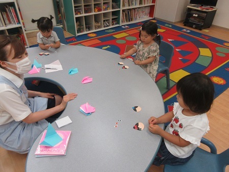 縄を使って、いろんな歩き方に挑戦です!一本線を左右交互に足を進め、一生懸命バランスをとりながら活動していました。制作はこの季節にぴったりな七夕制作でした。前回学んだ形、丸、三角、四角を飾りに取り入れ、素敵な作品を作りました。