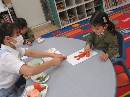 いろいろなお野菜の名前や形を確認しながら、野菜スタンプを行いました。感触や香りも感じながら、丁寧にスタンプしていました!タンバリンの持ち方も上手になり、音楽に合わせて楽しみながら活動しました。