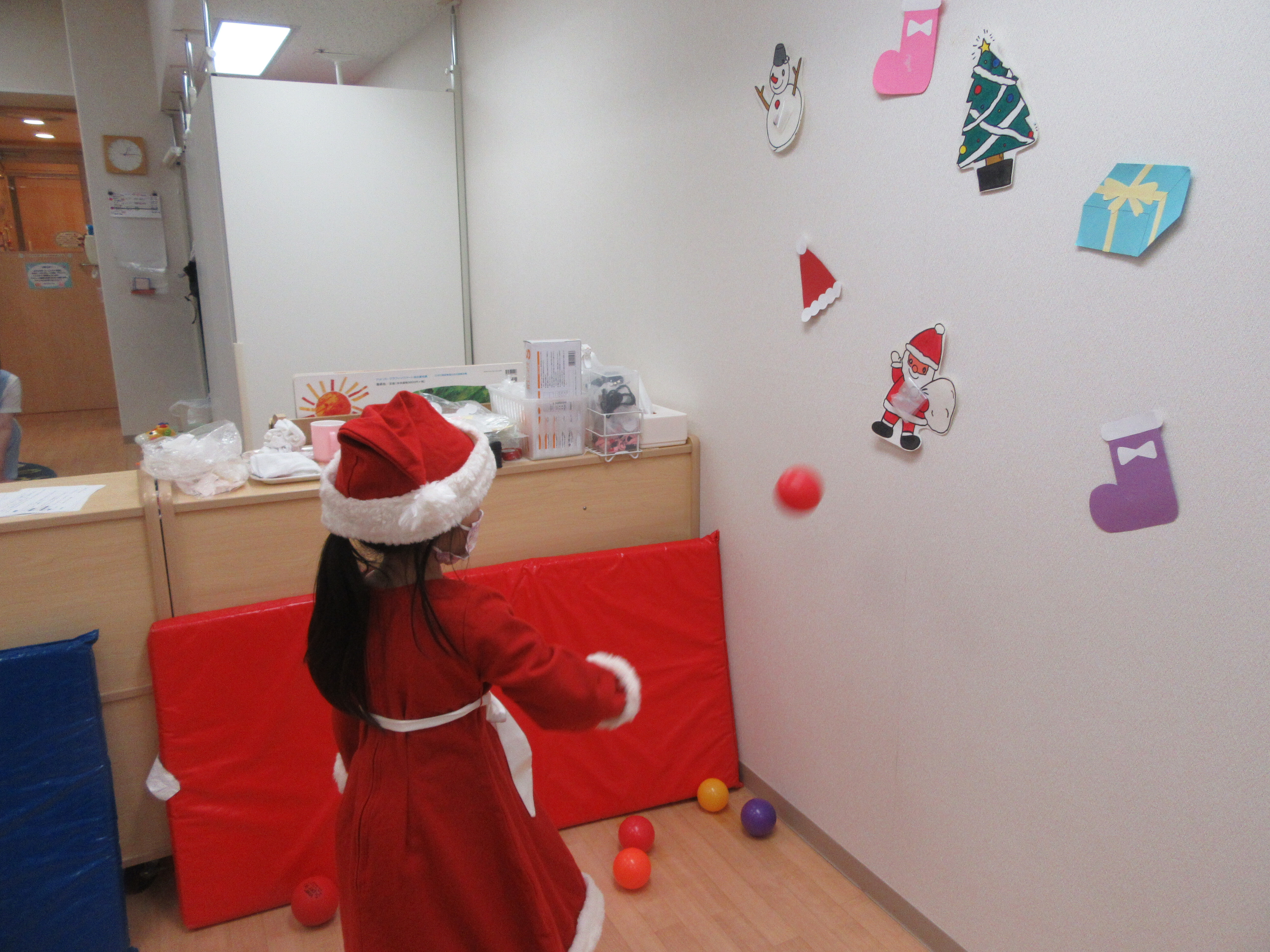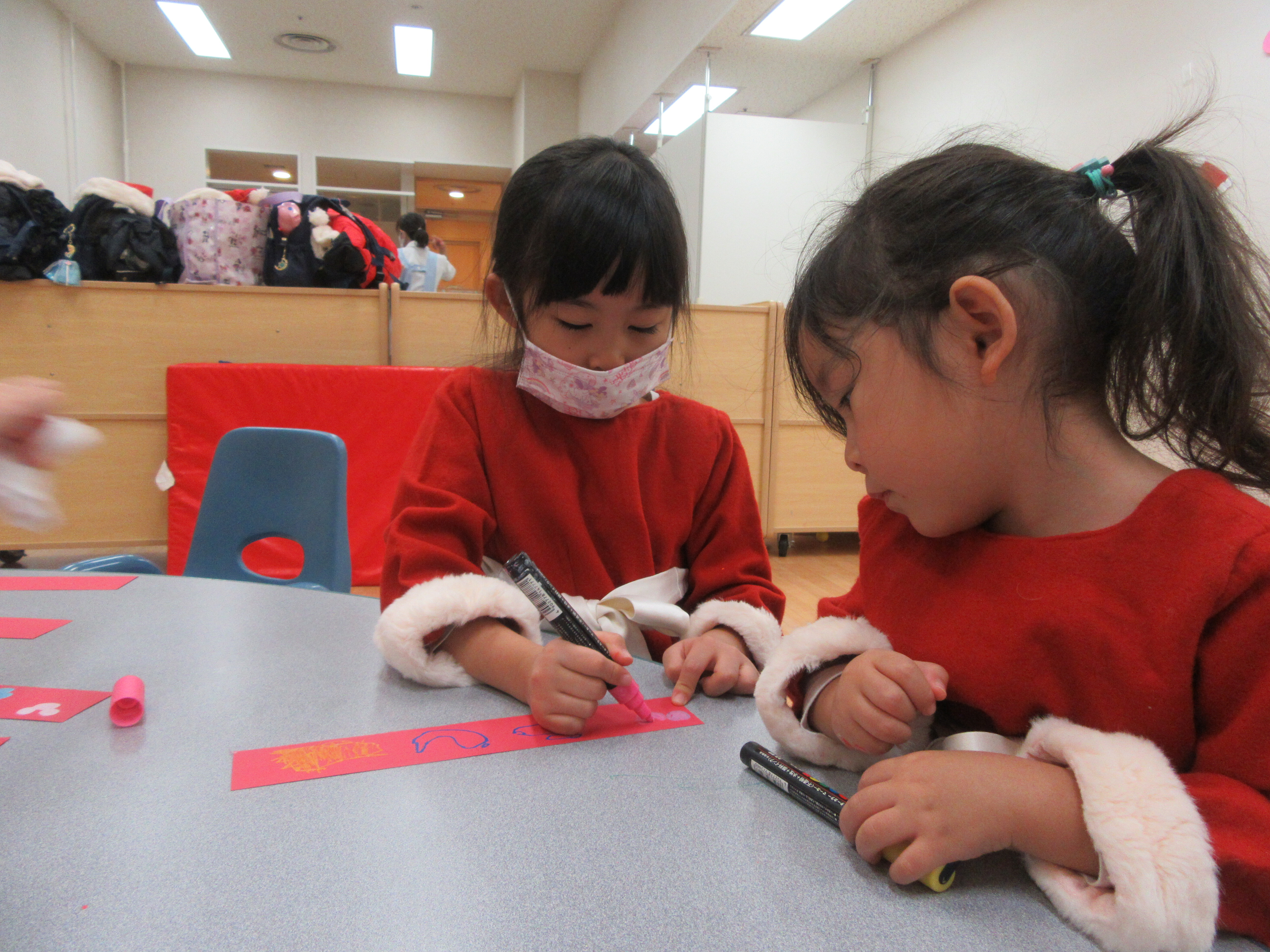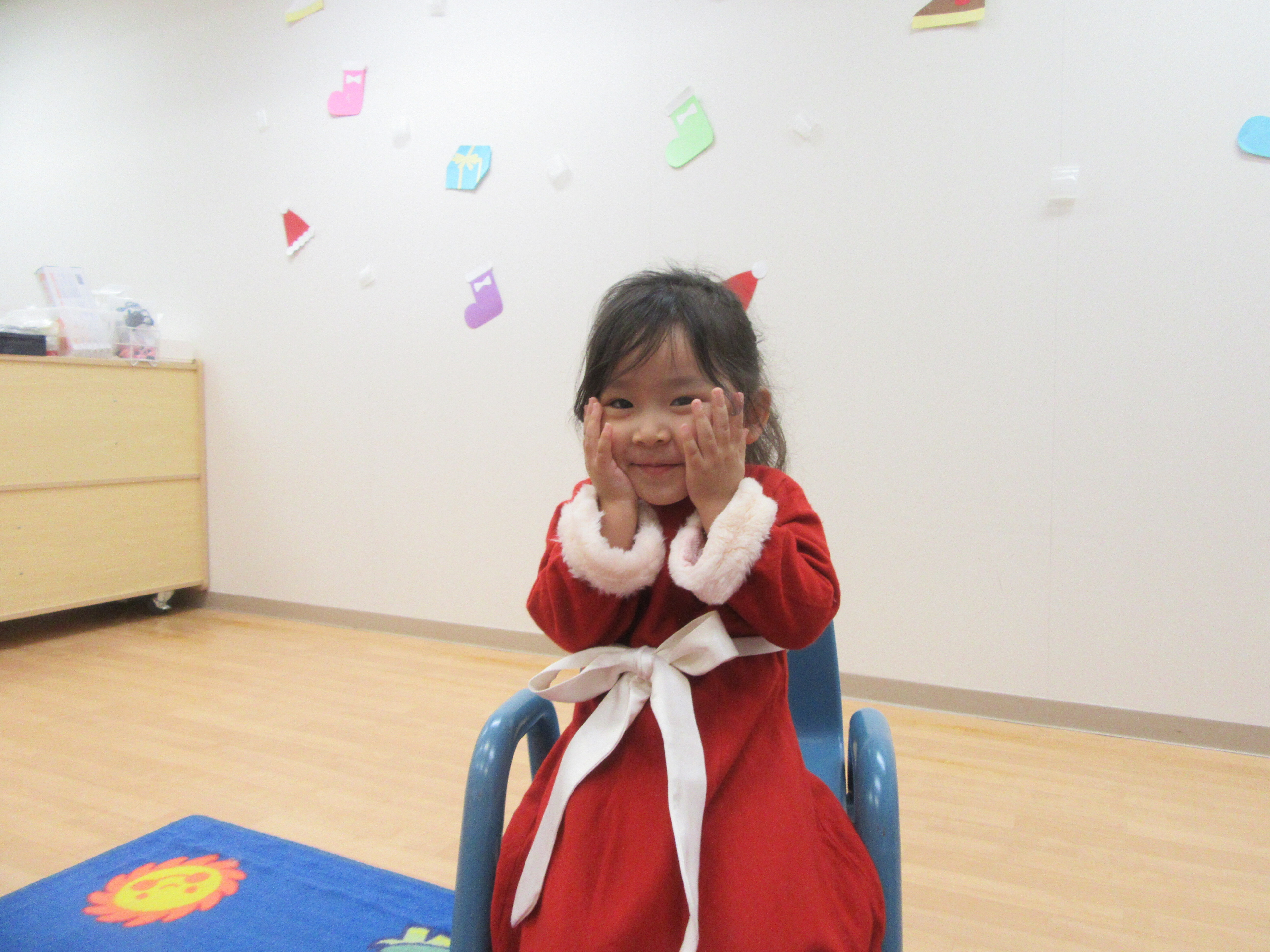 クリスマスパーティーをしました。サンタのコスチュームに着替えて、ゲームやクラフトを楽しみました♪ 作ったサンタネックレスを首にかけてみんなで記念撮影をしました。