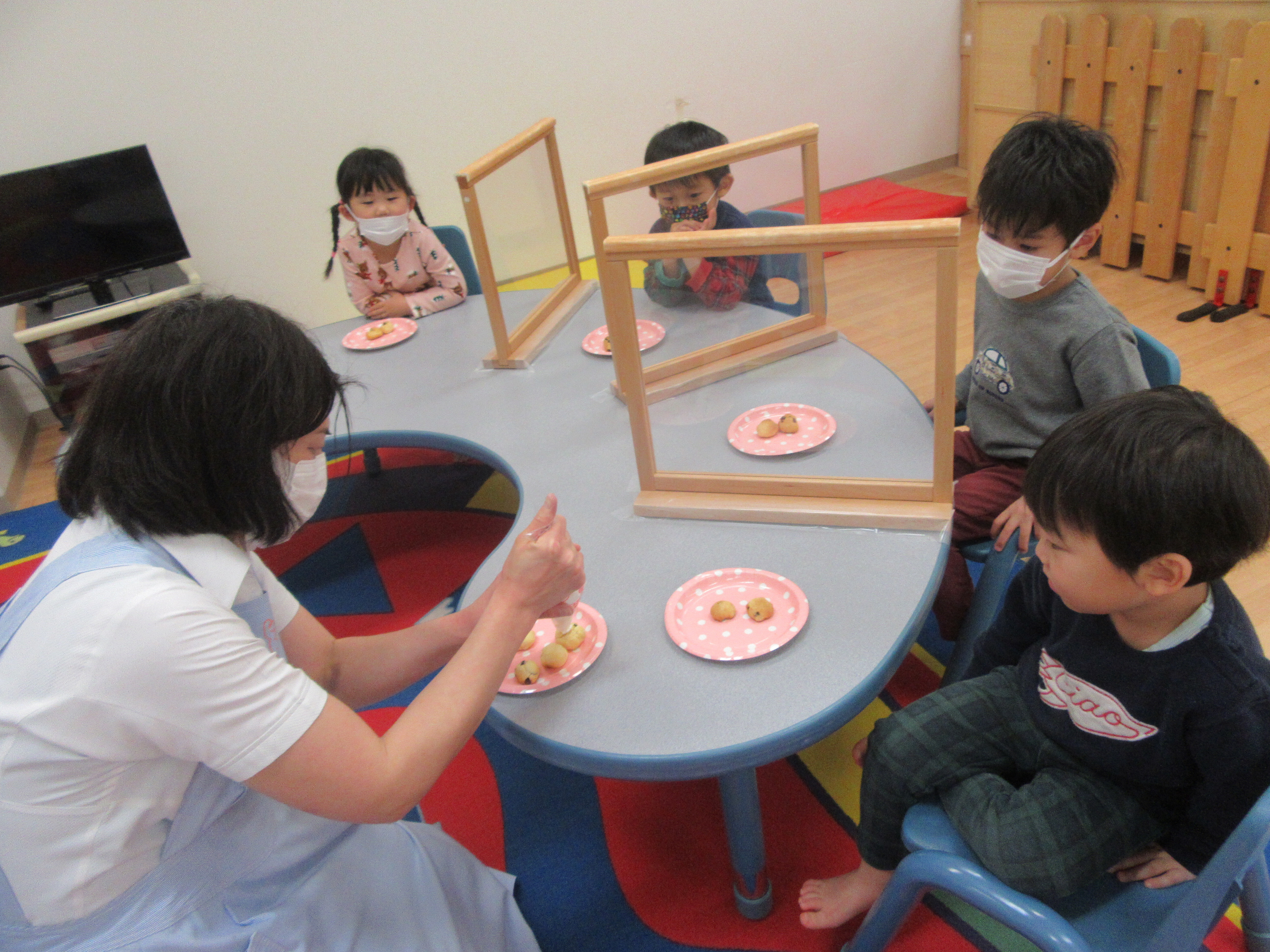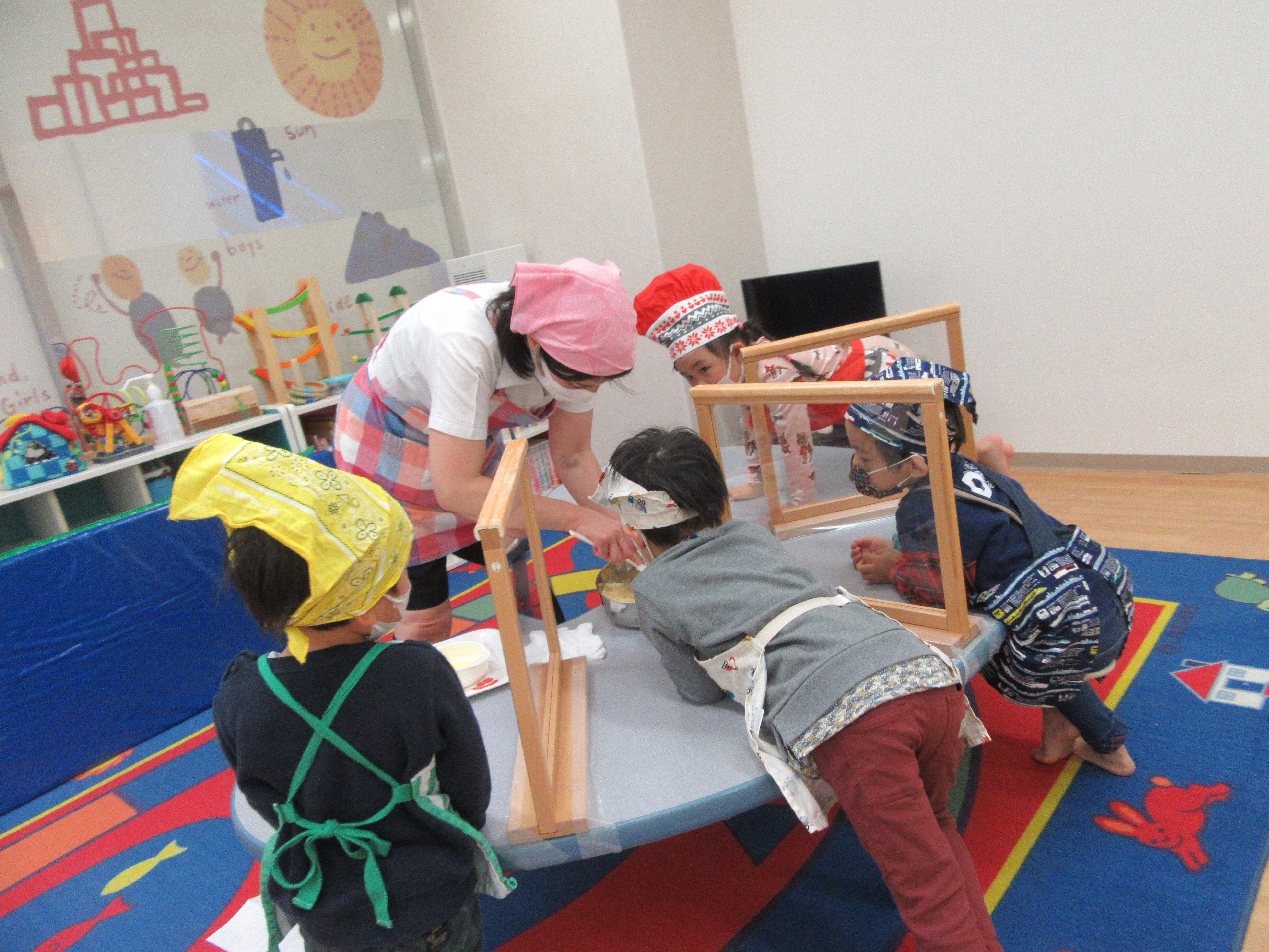 チョコチップクッキーを作りました!生地に小さいつぶつぶチョコを混ぜて焼き、クリームでトッピングをしました。ゲームではしっぽ取りゲームをして楽しみました♪