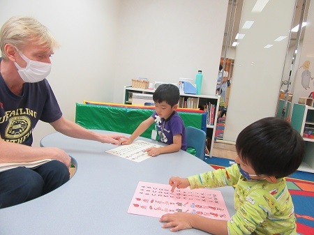 大文字と小文字を見比べながら、アルファベットについて学んでいます。順番や、発音などもよく覚えてきました!机でのお勉強の後は、英語のお歌に合わせて体を動かして楽しみました。
