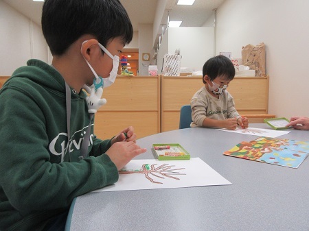 英語でのご挨拶が終わった後は、絵本を楽しみました!季節にちなんだワークも行いました。木にカラフルな葉っぱをたくさん描いて、素敵な秋の木が完成しました。お友だちの様子も気になるようで、どんなに木になったか見せ合いっこをしていました!