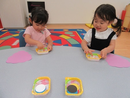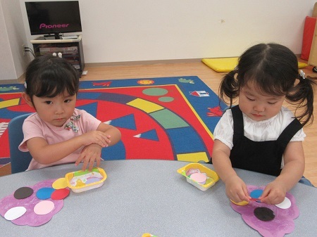 ぶどうをつくりました。いくつかの粒をひとつひとつ丁寧にのりづけをし、それぞれのカラフルなぶどうができあがりました。ひらがなカードを使った遊びでは楽しみながら「さ行」を学びました。