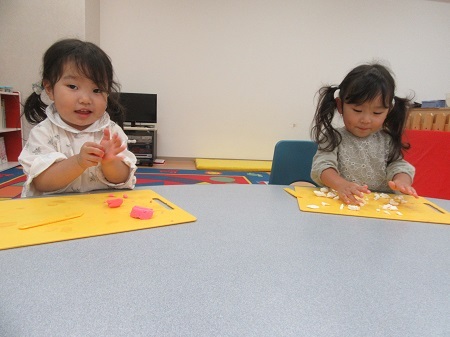 粘土を楽しみました。丸める、伸ばすの他にも伸ばしたものを切ったりもしました。丸めたり切ったりしたものを集めてどっちが多いかな?と多い、少ないの比較も楽しみながら学びました。手のひらの上で丸めることがとても上手になってきました。