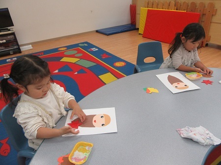 ひも通しを楽しみました。ビーズを一粒ずつ慎重にひもに通し、長くなったら素敵なネックレスになり大喜び!落ち葉拾いごっこをしながら秋の制作にも取り組みました。色とりどりの葉っぱを綺麗に貼ることが出来ました。