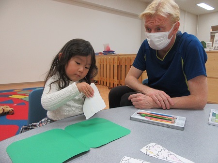 塗ったり貼ったりしながら、クリスマスカードを作りました!ツリーやプレゼントの箱など、ワクワクするようなイラストがいっぱいです。レッスンの後半は、しかけ絵本も楽しみました。